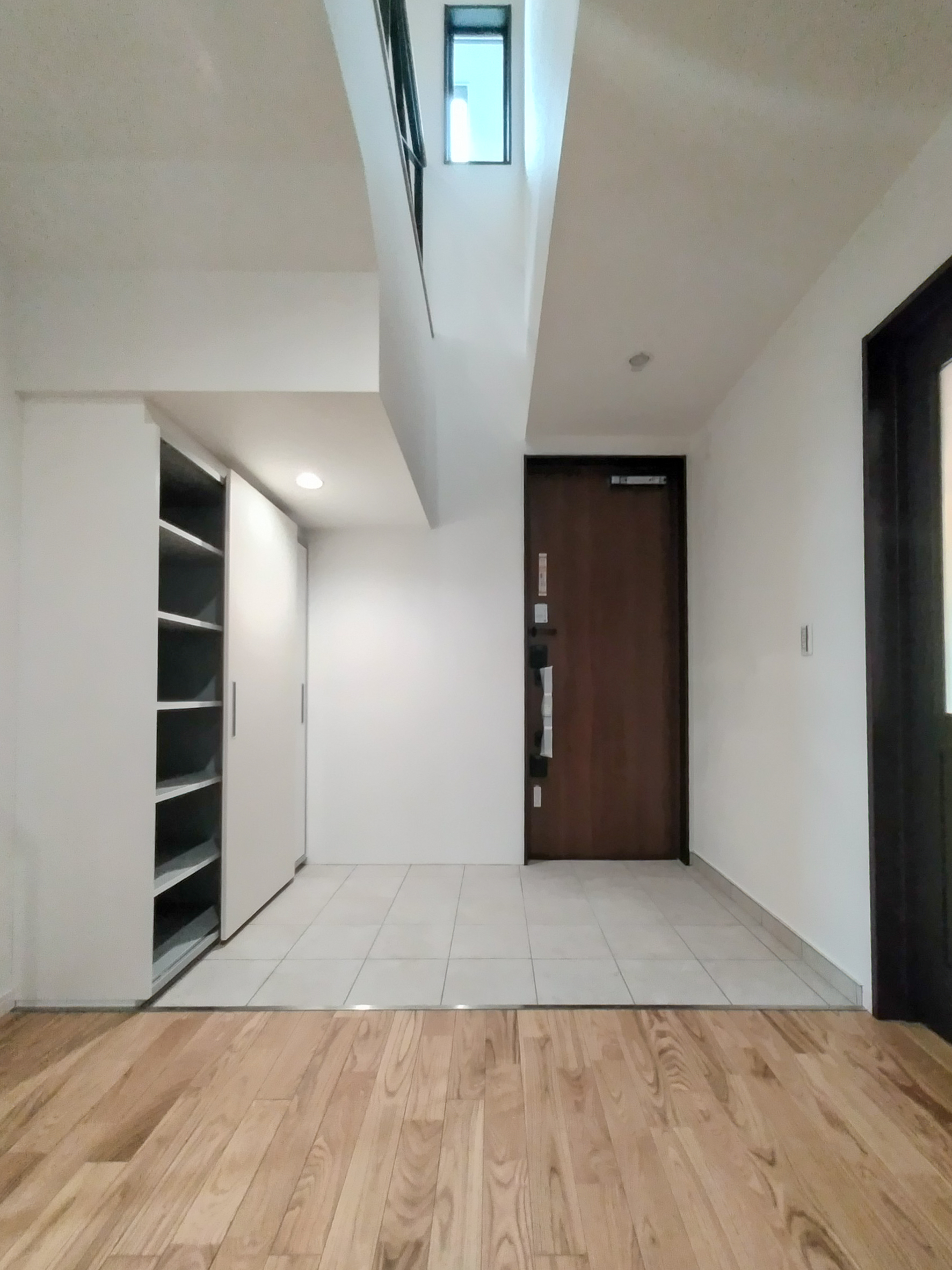 玄関からの採光が取り込めないため吹抜け上部と階段から明るさを確保