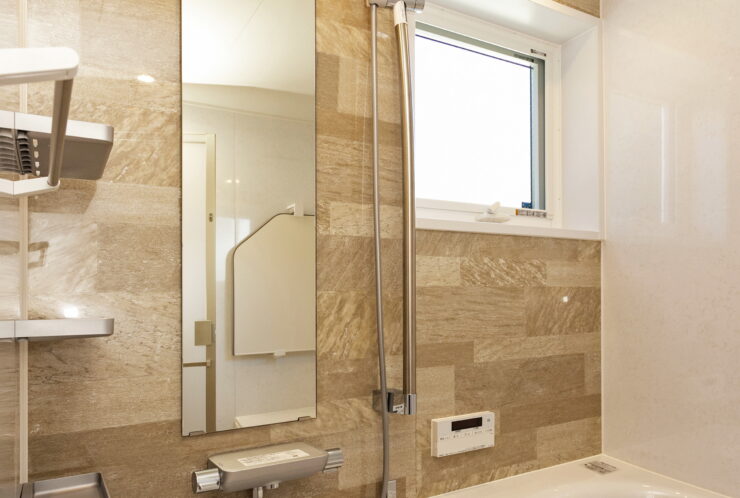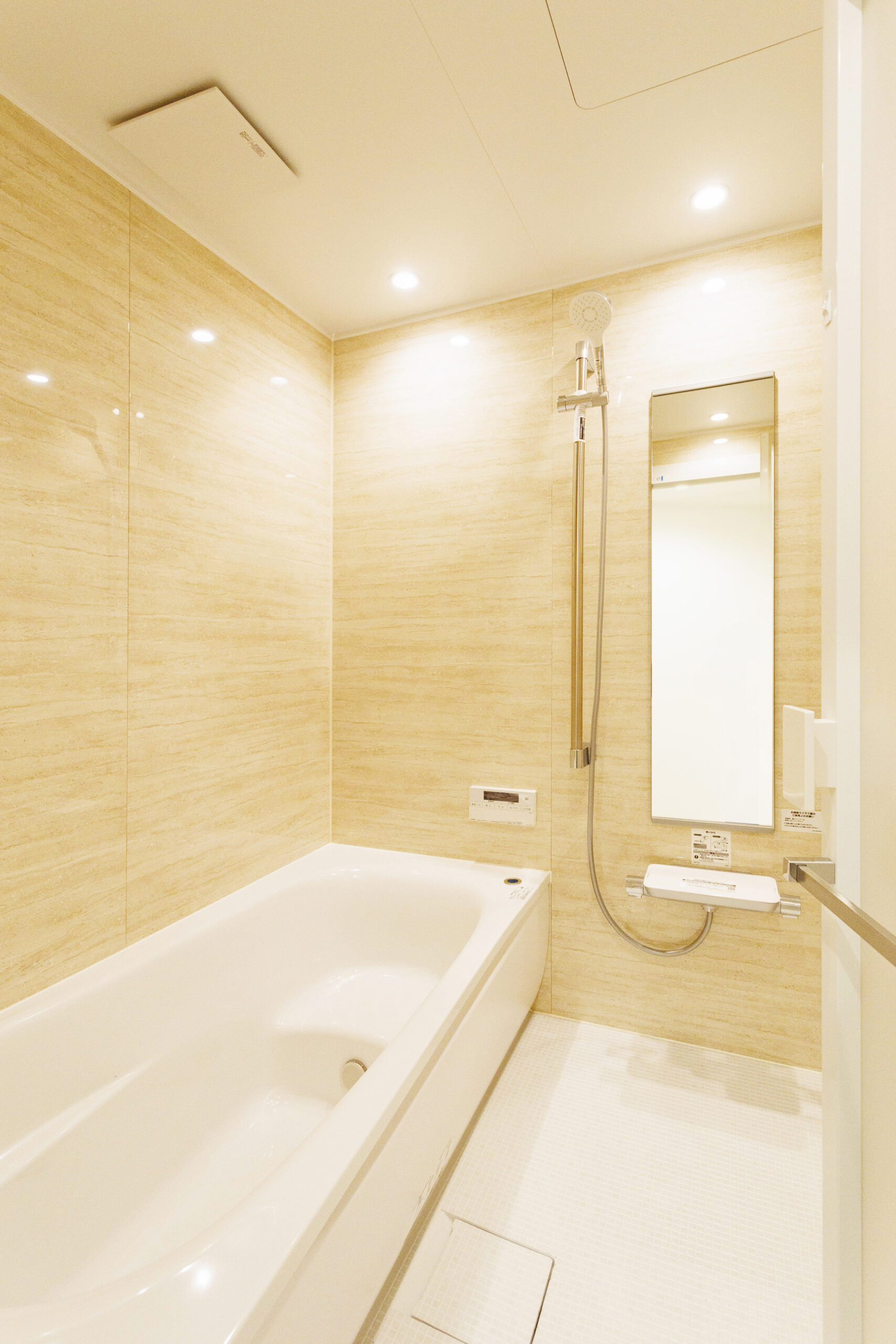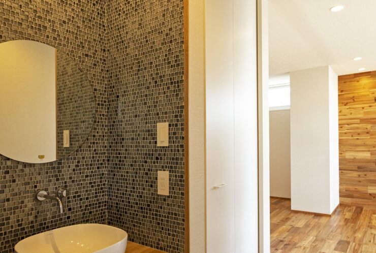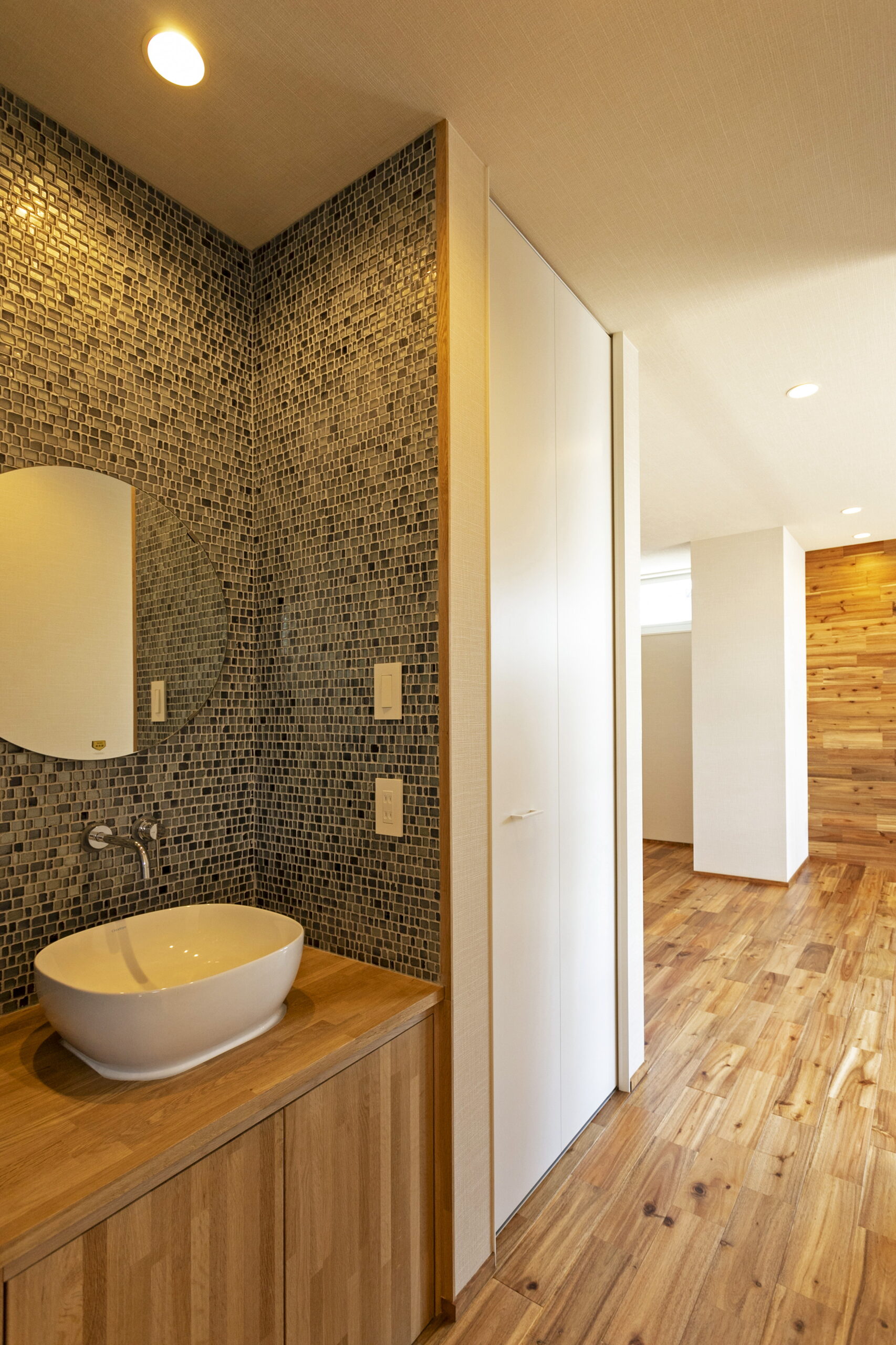 壁には鏡面仕上げのタイルを貼りホテルライクな仕上がり。(ADVAN セラミカエコストーン)