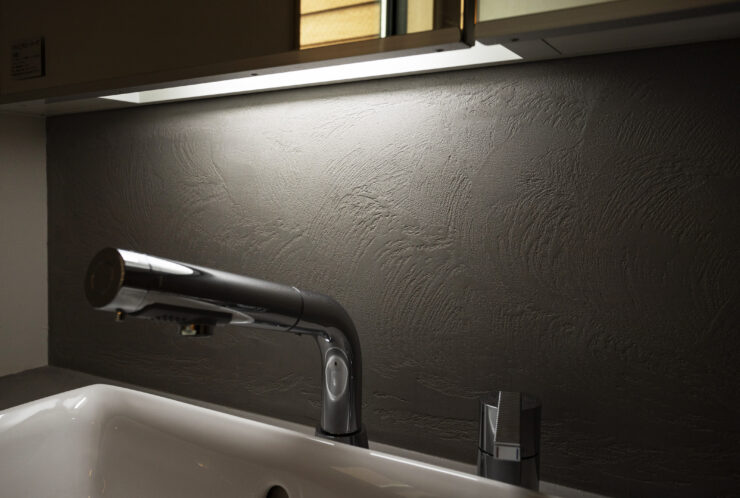洗面カウンターには防水性に優れたユーロプラストという左官材料を使用。ユーロプラストは職人さんの手作業による世界にひとつだけのデザインが特徴です。