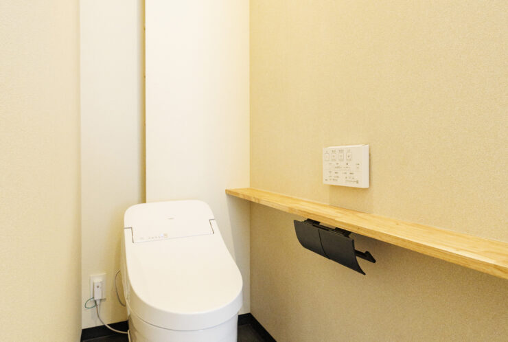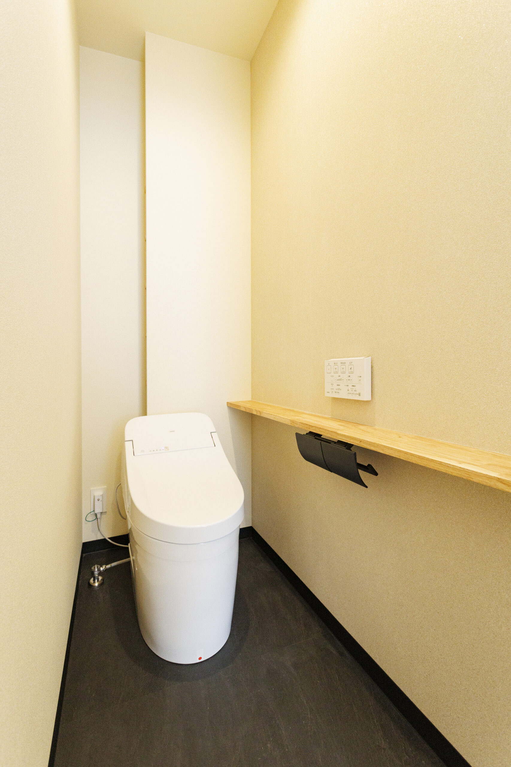 造作の小さな棚が付いた1階トイレ。背面にはトイレットペーパーを収納できる隠しスペースがあります。