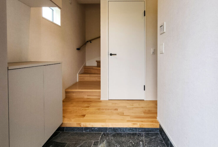 タイル貼の玄関。アイコットリョーワのアーレイ300角。