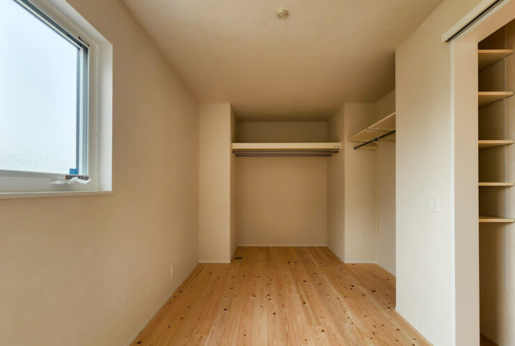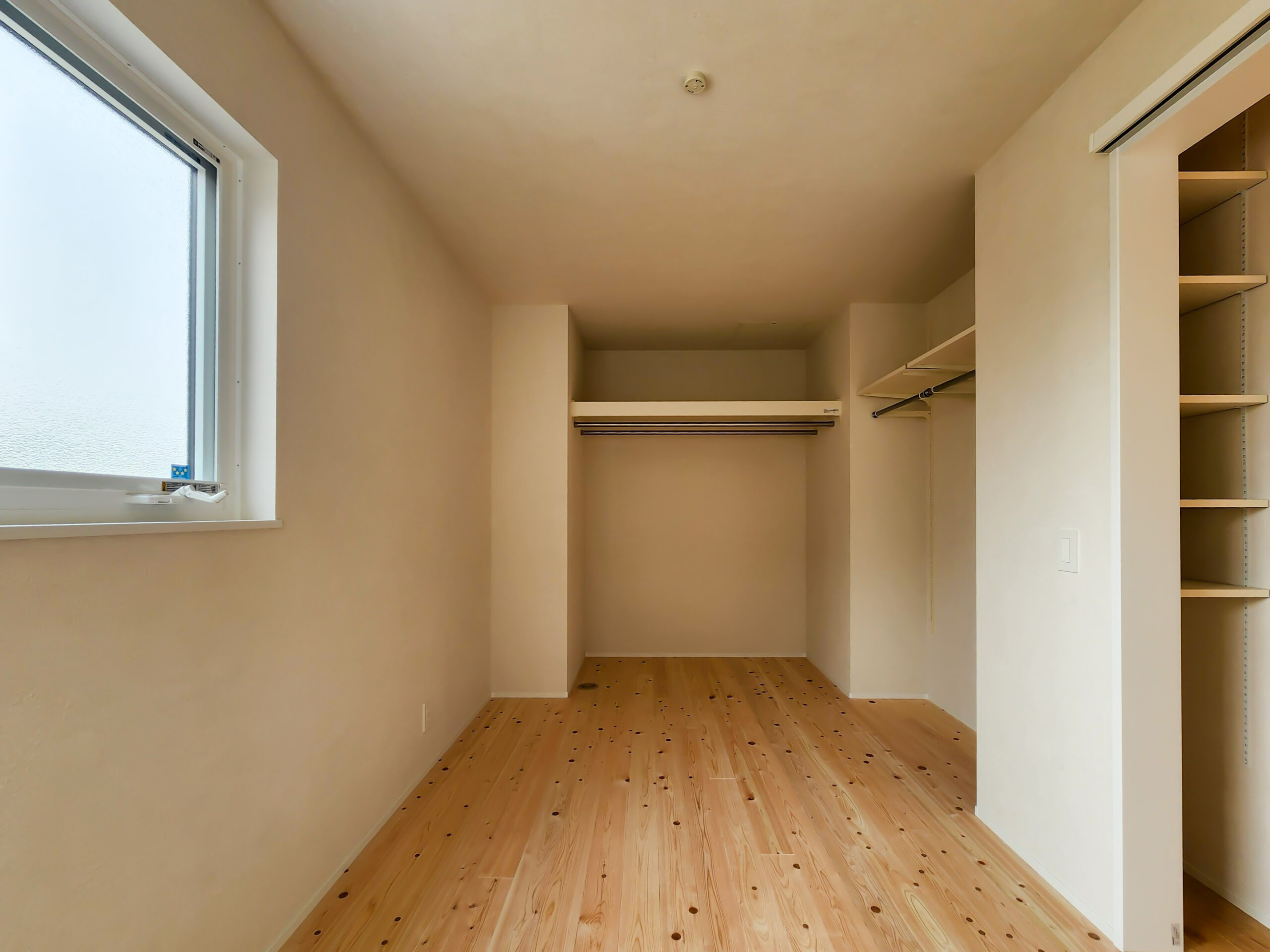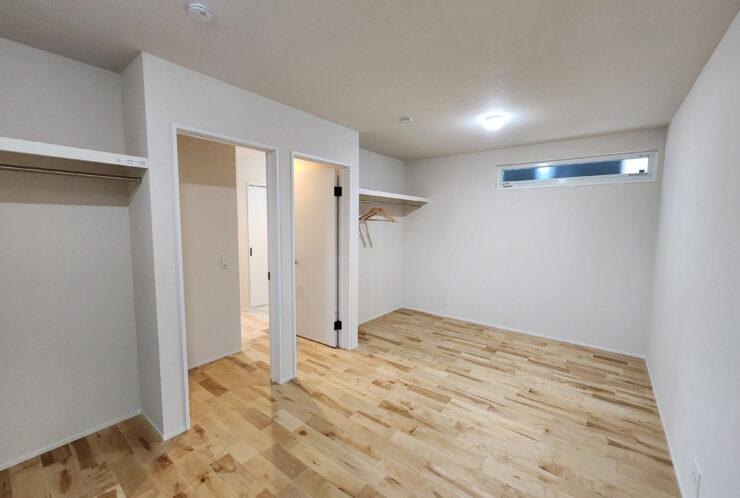 将来2室に分けることを想定した子供部屋。出入口を2ヶ所設け、コンセントの位置も将来に置く家具の位置を想定しています。