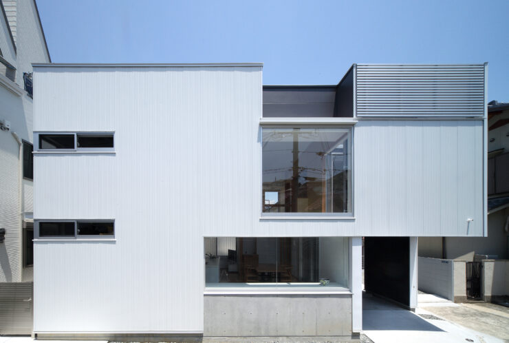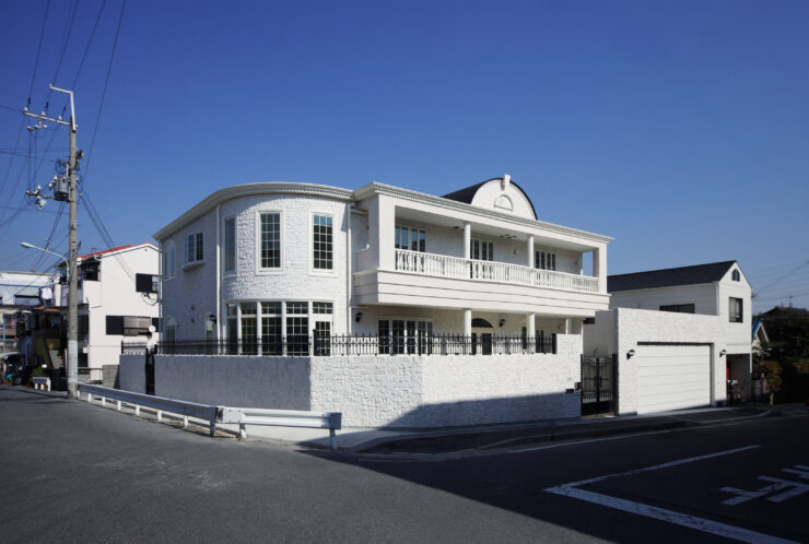 清潔感のある真っ白な外装材が印象的。シルバーのデザイン格子でよりクールな雰囲気に。