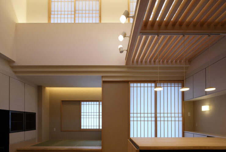 キッチンを下がり天井とし間延びしがちなLDK空間のアクセントにしました