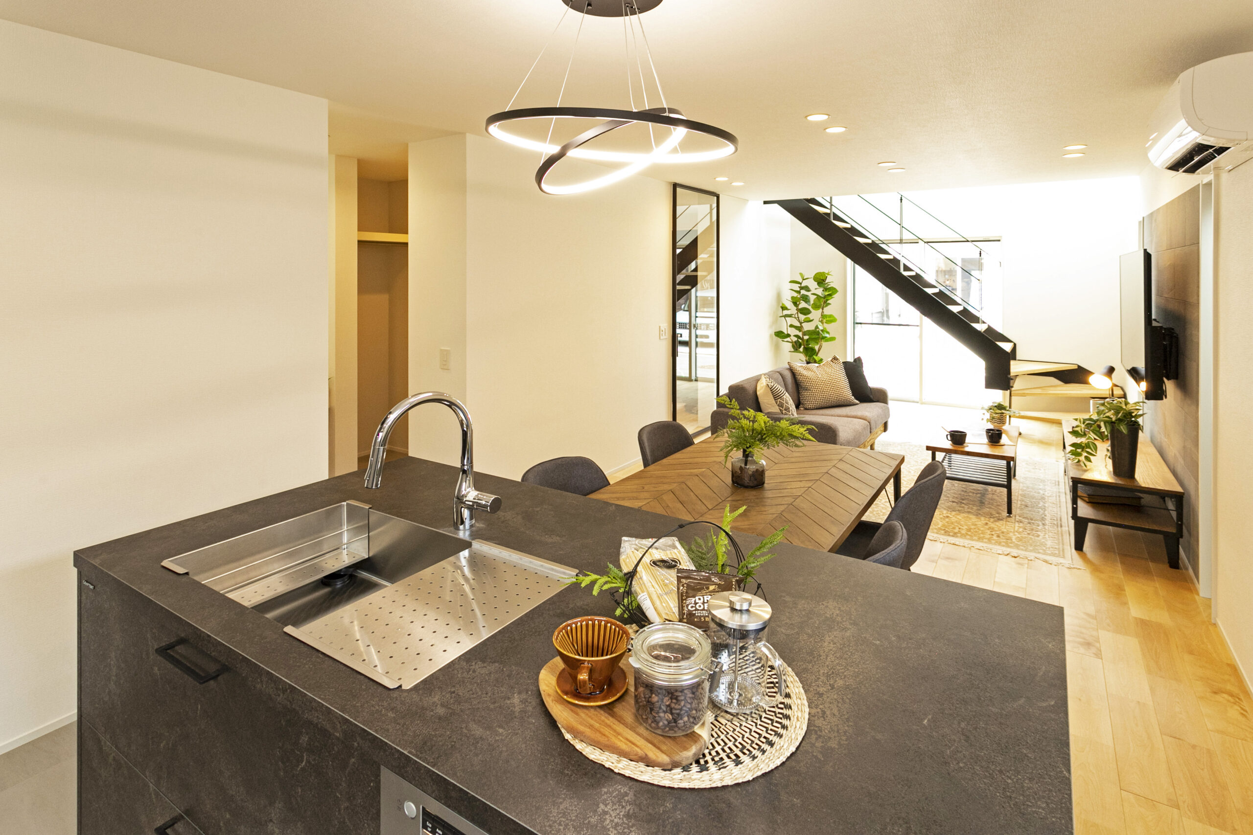 天井をブラックにすることで引き締まった印象に。