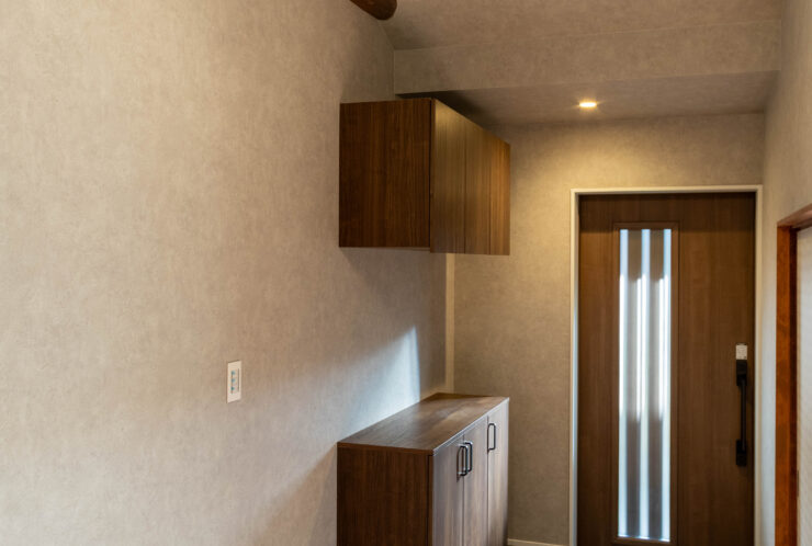 玄関収納(LIXIL)とタイル(アイコットリョーワ)を同系統のグレーにし統一感を持たせています。