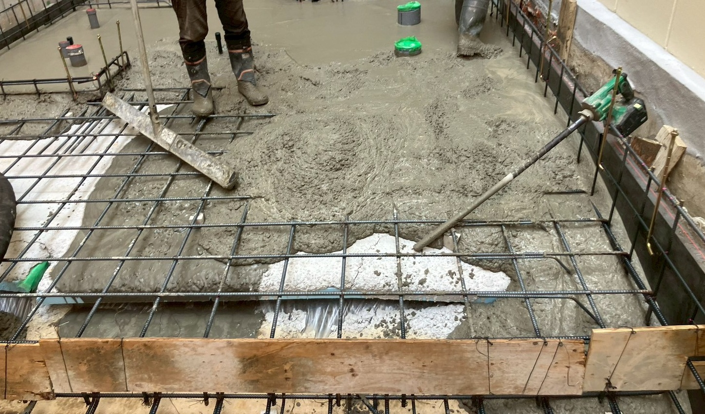 先日、配筋作業が完了したので、ベースコンクリートを打設している状況です。