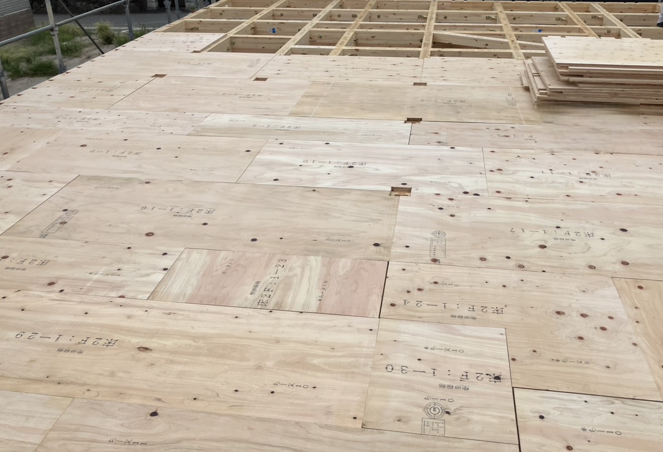 1階の柱を梁でつなぐ床組をしたら、その上に構造用合板を施工していきます。